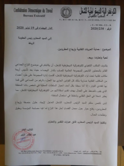 تتابع اللجنة المحلية باقليم مديونة والنواحي عن الجمعية المغربية لحقوق الانسان بالبرنوصي وشبكة تقاطع للحقوق الشغلية بالدار البيضاء بمنطقة البرنوصي تيط مليل باستنكار كبير طرد اربعة اعضاء من المكتب النقابي لعمال الشركة العالمية للصلب فرع سيدي حجاج وتيط مليل لالشئ الا لتاسيسهم مكتبا نقابيا داخل المركزية النقابية الكونفدرالية الديمقراطية للشغل وفق ما تنص عليه مدونة الشغل على علاتهاوالتي اصبحت تداس باقدام الباطروناتحت انظار ومسامع الجهات الوصيةخارقة كل بنودها وما تم الاقرار به في ديباجتها من ان (الحرية النقابية حق من الحقوق الأساسية في العمل، تندرج ممارستها في إطار الوسائل المعترف بها للعمال والمشغلين للدفاع عن حقوقهم المادية والمعنوية ومصالحهم الاقتصادية والاجتماعية والمهنية.ويترتب عن ذلك بصفة خاصة، توفير الحماية للممثلين النقابيين وتوفير الشروط الملائمة لتمكينهم من الاضطلاع بدورهم التمثيلي داخل المقاولة والمساهمة في عملية التنمية الاقتصادية والاجتماعية وفي بناء علاقات مهنية سليمة تخدم مصلحة العمال والمشغلين على حد سواء..)
