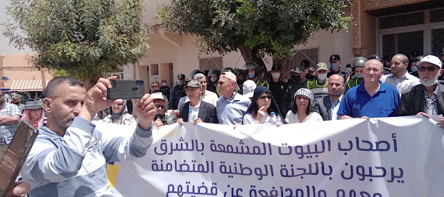 زوال اليوم قام وفد فرع الجمعية المغربية لحقوق الانسان بوجدة رفقة عدد من نشطاء حقوقيين وسياسيين وجمعويين وكذا هيئات حقوقية وطنية ودولية وحضور أعضاء اللجنة الوطنية للدفاع والتضامن عن اصحاب البيوت المشمعة بالمغرب، لمؤازرة اصحاب البيوت المشمعة بوجدة.